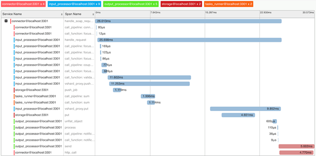 We implemented support for the OpenTracing protocol to bring a better understanding of the system mechanisms and request profiling. On demand, the system can send information about how the request was executed to tools supporting this protocol (e.g. Zipkin):
