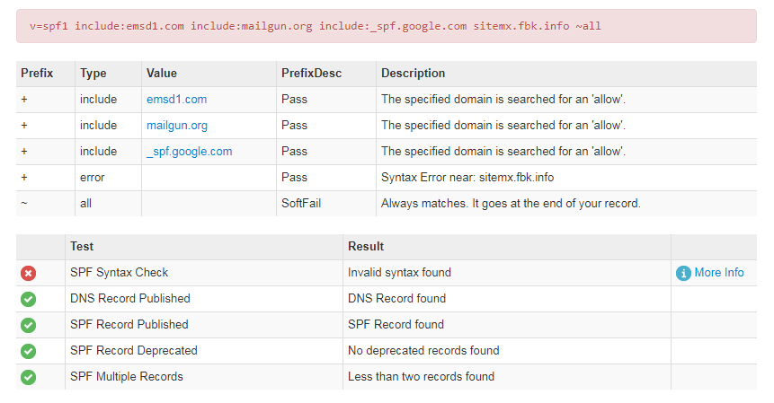 Check the validity of the SPF record for syntax, the limit for DNS queries (for example, using mxtoolbox.com). When forming an SPF, all sources of mailings should be taken into account (do not forget CRM systems, all currently utilized delivery infrastructures, including those through which one-time marketing campaigns are conducted). It is recommended to set allowed servers for the domain through the list of networks (‘ip4’ / ‘ip6’). SPF is checked for the sender address from the SMTP envelope. Verify that the SMTP envelope domain (envelope-from) matches the domain from the From header. Common SPF errors are listed in this article (https://medium.com/hackernoon/myths-and-legends-of-spf-d17919a9e817).