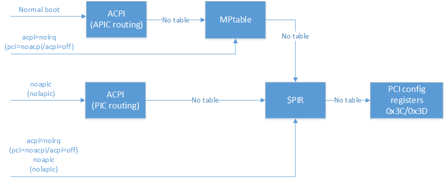 此外,我们还将研究操作系统寻找中断路由表(ACPI / MPtable / $ PIR)的顺序,以及以下引导选项的影响: