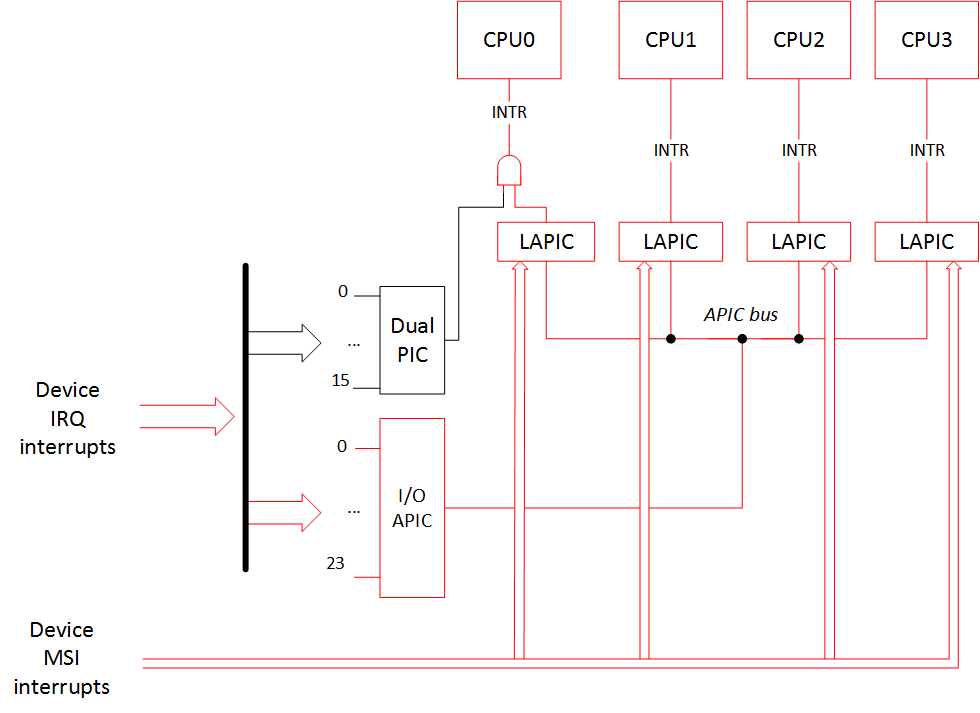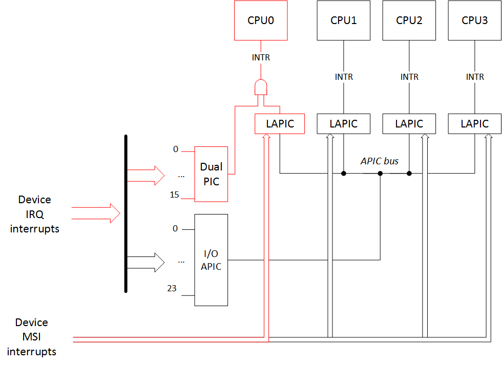 This happens because without the ACPI MADT table (Multiple APIC Description Table) and the necessary info from the MPtable, the operating system doesn't know APIC identifiers (APIC IDs) for the other CPUs and can't work with them. But the LAPIC of the main CPU0 works because we haven't disabled it, and MSI interrupts can still go to it. So the interrupt picture would be: