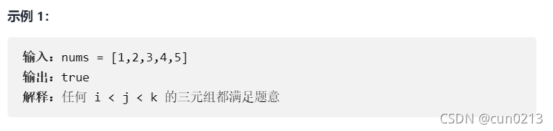 如果存在这样的三元组下标 (i, j, k) 且满足 i < j < k ,使得 nums[i] < nums[j] < nums[k] ,返回 true ;否则,返回 false 。