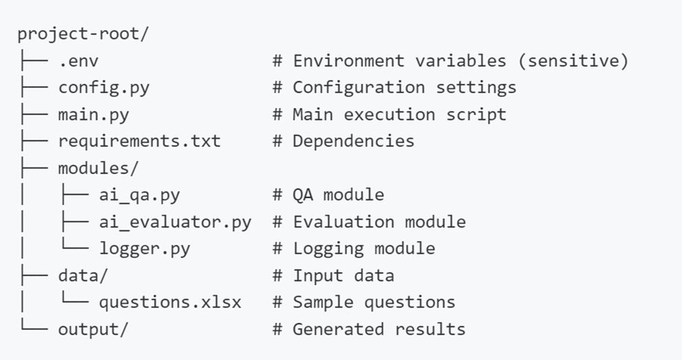 | main.py | 入口层 | 串联各模块(调用 AI 问答、评估、日志等功能),作为程序启动入口 | 简化执行流程,只需运行main.py即可启动整个任务 |