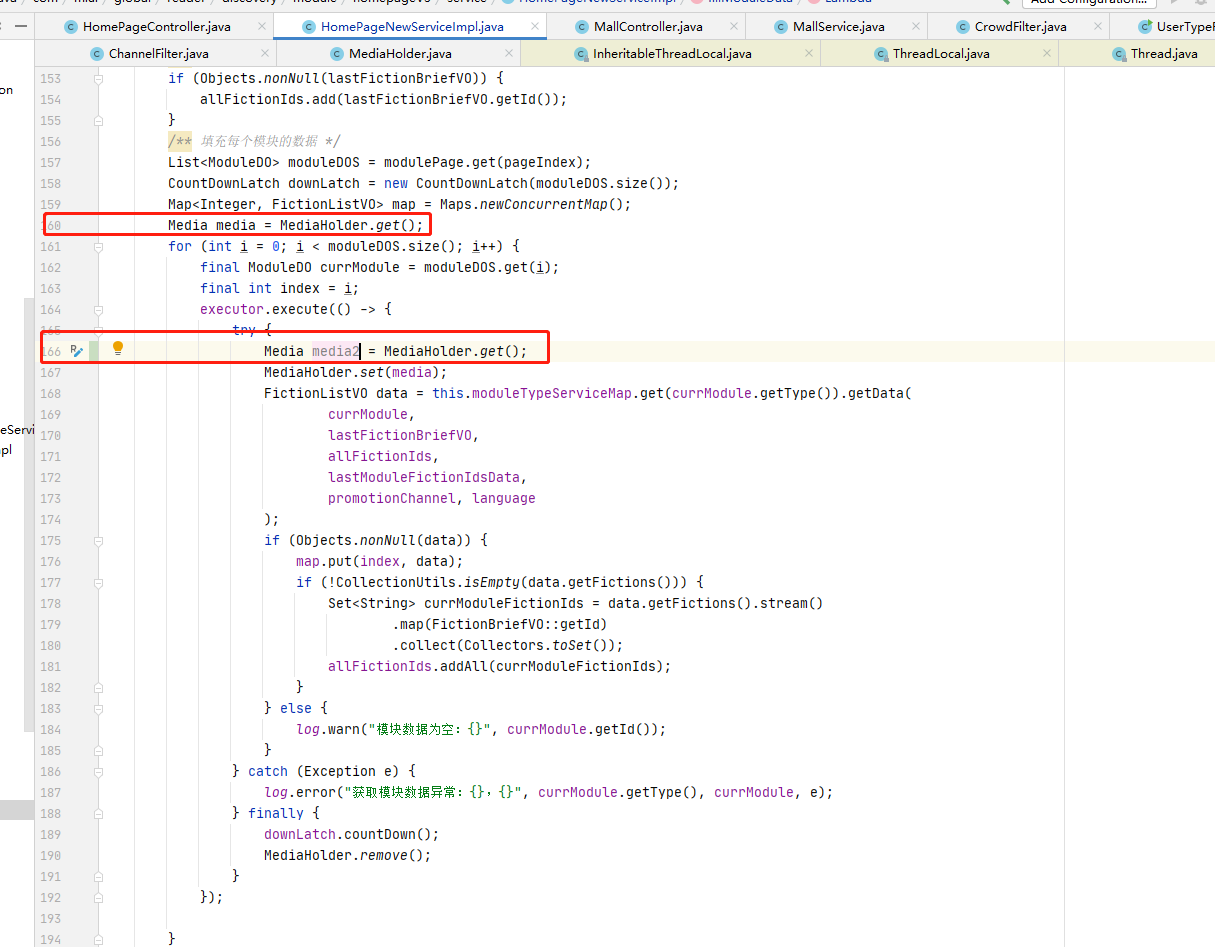 2、无意发现在线程池的execute方法中使用了MediaHolder这个类,这个类中使用了InheritableThreadLocal,然后就想到线程池中使用ThreadLocal会有些问题