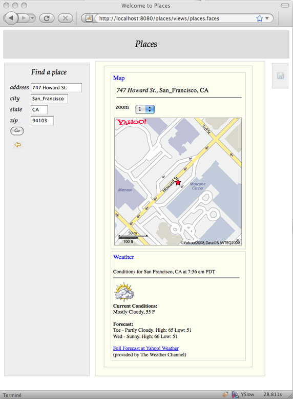 JSF 2使您无需任何Java代码或配置即可实现完全可配置的组件。 您还可以嵌套复合组件,这使您可以将复杂的组件分解为更小,更易于管理的部分。 例如,图8显示了place组件,其中显示了给定地址的地图和天气信息: