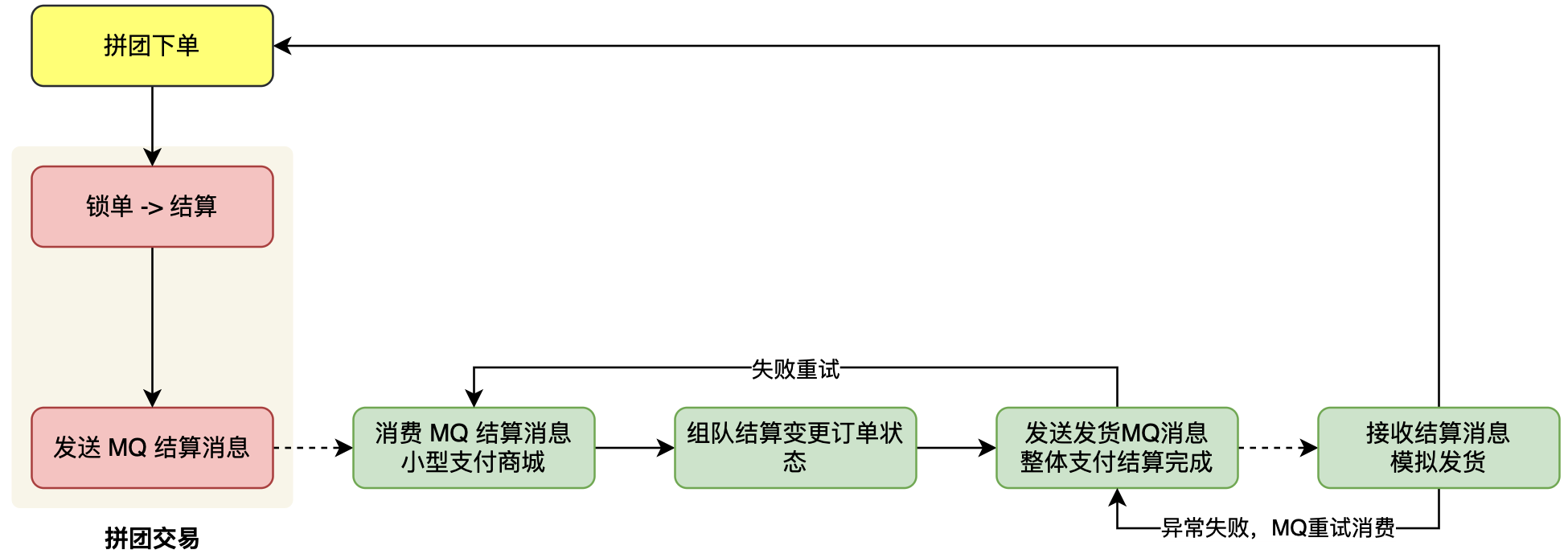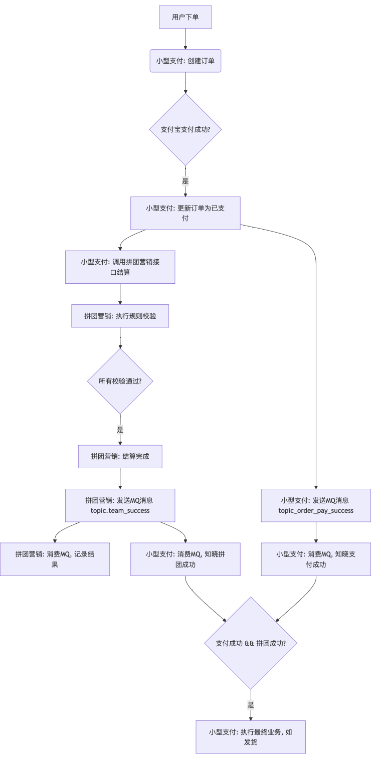 一句话总结:拼团服务告诉商城服务:“团满了,你可以结算了”。 内部解耦 (处理发货/后续动作):