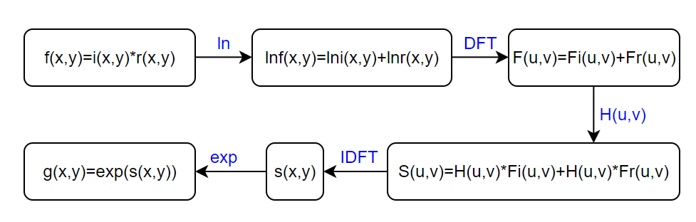 同态滤波算法将图像表示为照明反射模型,即图像亮度是照明与反射的乘积。作为一种频域滤波器,它认为图像中的低频分量对应照明部分,高频分量对应反射部分。因此,可以设计这样的滤波器:其对低频部分进行抑制,对高频部分增强。当图像应用此滤波器后,照明部分被减弱,纹理细节部分被增强。