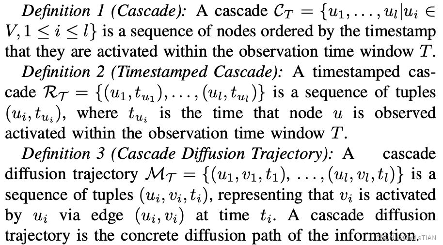 当信息在社会网络上传播时,它将从一个或几个用户开始,并传播到他们的外邻和外邻的外邻,这将产生信息级联。一旦一个用户受到信息的影响,它的状态就会从不活跃变为活跃,我们就说它被激活了。它的状态将保持活跃,在接下来的传播过程中不会改变。