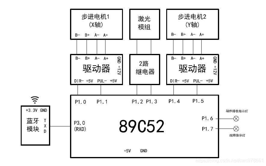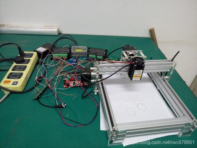 时间比较久之前了2016年毕业。实现的功能是使用手机蓝牙串口工具发送G代码给单片机连接的HC09蓝牙模块,单片机进行插补最终实现控制两个步进电机实现激光雕刻。