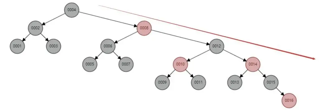 红黑树顺序插入 1~16 个节点,查找 id=16 需要比较的节点数为 6 次。观察一下这个树的形态,是不是当数据是顺序插入时,树的形态一直处于“右倾”的趋势呢?从根本上上看,红黑树并没有完全解决二叉查找树虽然这个“右倾”趋势远没有二叉查找树退化为线性链表那么夸张,但是数据库中的基本主键自增操作,主键一般都是数百万数千万的,如果红黑树存在这种问题,对于查找性能而言也是巨大的消耗,我们数据库不可能忍受这种无意义的等待的。