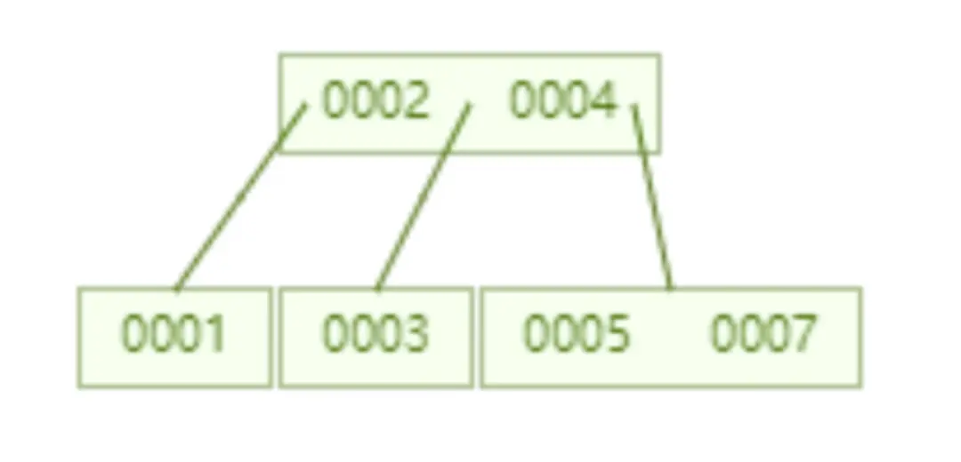 下面这个 B 树,每个节点限制最多存储两个 key,一个节点如果超过两个 key 就会自动分裂。比如下面这个存储了 7 个数据 B 树,只需要查询两个节点就可以知道 id=7 这数据的具体位置,也就是两次磁盘 IO 就可以查询到指定数据,优于 AVL 树。