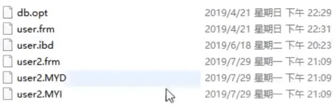执行这两个指令后,系统出现了以下的文件,说明这两个引擎数据和索引的组织方式是不一样的。