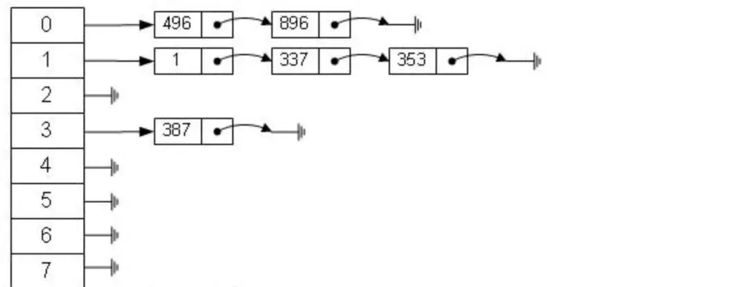 但是哈希算法有个数据碰撞的问题,也就是哈希函数可能对不同的 key 会计算出同一个结果,比如 hash(7)可能跟 hash(199)计算出来的结果一样,也就是不同的 key 映射到同一个结果了,这就是碰撞问题。解决碰撞问题的一个常见处理方式就是链地址法,即用链表把碰撞的数据接连起来。计算哈希值之后,还需要检查该哈希值是否存在碰撞数据链表,有则一直遍历到链表尾,直至找到真正的 key 对应的数据为止。