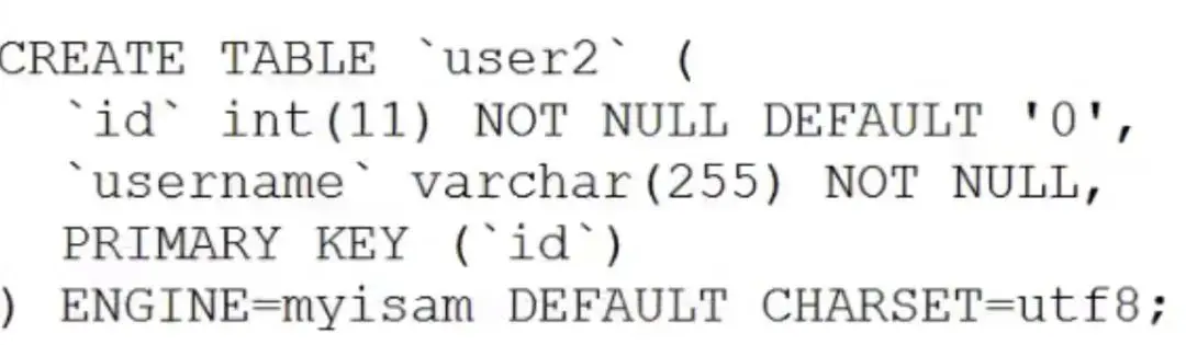 MyISAM 虽然数据查找性能极佳,但是不支持事务处理。InnoDB 最大的特色就是支持了 ACID 兼容的事务功能,而且他支持行级锁。MySQL 建立表的时候就可以指定引擎,比如下面的例子,就是分别指定了 MyISAM 和 InnoDB作为 user 表和 user2 表的数据引擎。