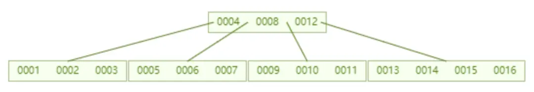 下面是一个存储了 16 个数据的 B 树,同样每个节点最多存储 2 个 key,查询 id=16 这个数据需要查询比较 4 个节点,也就是经过 4 次磁盘 IO。看起来查询性能与 AVL 树一样。