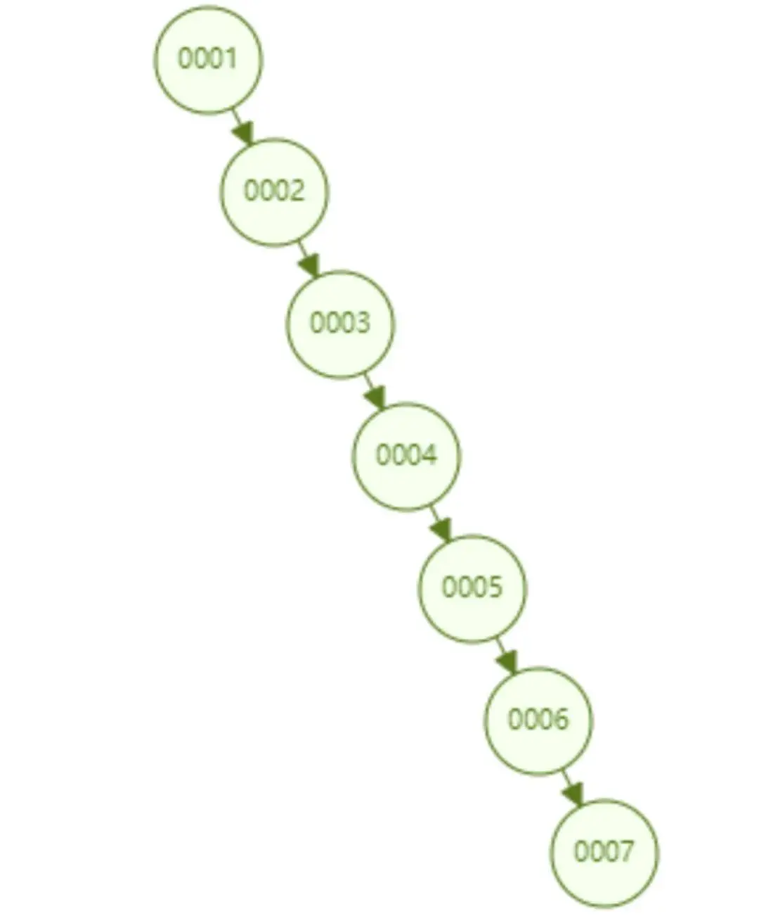 但是普通的二叉查找树有个致命缺点:极端情况下会退化为线性链表,二分查找也会退化为遍历查找,时间复杂退化为 O(N),检索性能急剧下降。比如以下这个情况,二叉树已经极度不平衡了,已经退化为链表了,检索速度大大降低。此时检索 id=7 的数据的所需要计算的次数已经变为 7 了。