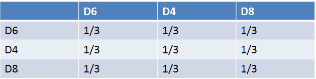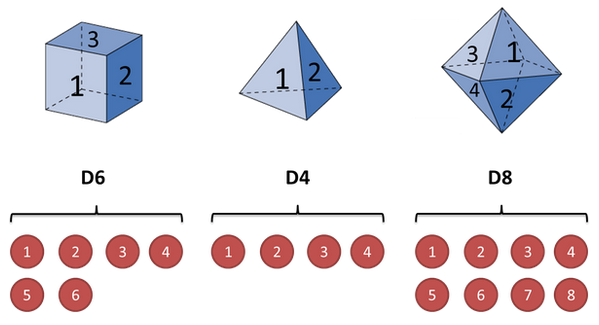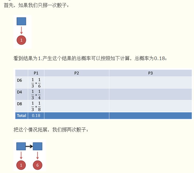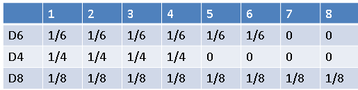 假设我手里有三个不同的骰子。第一个骰子是我们平常见的骰子(称这个骰子为D6),6个面,每个面(1,2,3,4,5,6)出现的概率是1/6。第二个骰子是个四面体(称这个骰子为D4),每个面(1,2,3,4)出现的概率是1/4。第三个骰子有八个面(称这个骰子为D8),每个面(1,2,3,4,5,6,7,8)出现的概率是1/8。