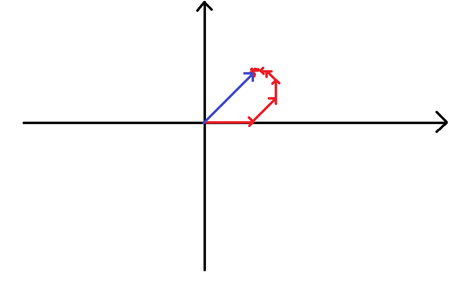 现在我们设这个操作 P = ( 1 2 − 1 2 1 2 1 2 ) P=\left(\begin{array}{ccc}\frac{1}{2}\ \ -\frac{1}{2}\\\frac{1}{2}\ \ \frac{1}{2}\end{array}\right) P=(21 −2121 21),那么实际上我们的等比数列求和就成了无限多个向量求和,见下图: