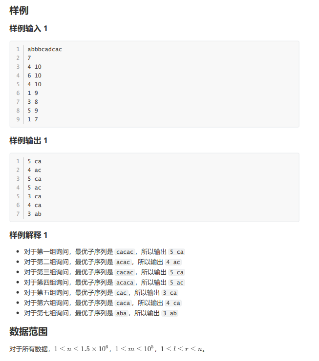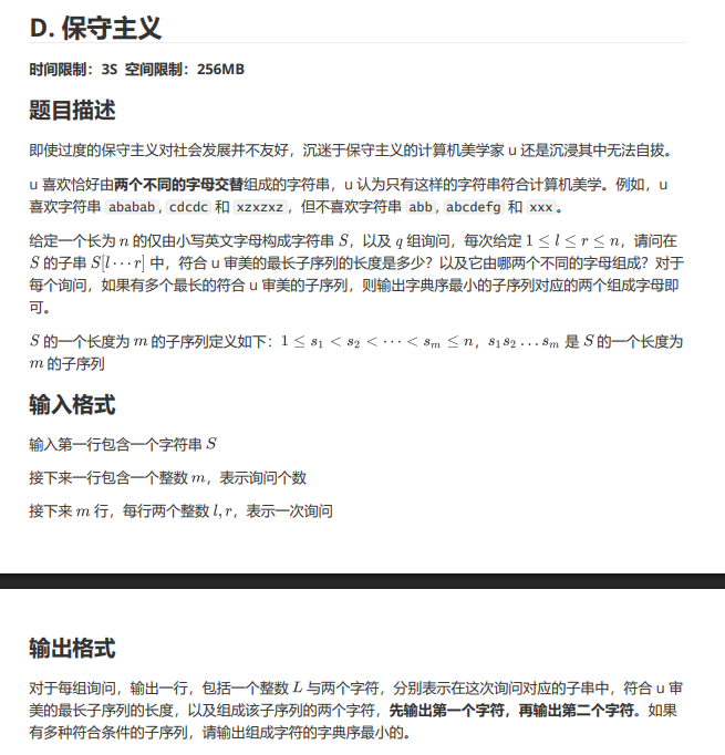 然后就是查询部分。我们可以考虑枚举是哪两个字母(反正查询次数很小,可以接受 2 6 2 26^2 262),当然,还是保证这两个字母不同。我们认定第一个枚举的字母是第一个出现的,于是我们可以找到这两个字母在这个区间内第一次出现的位置和最后一次出现的位置,因为我们不知道最后一个字母会是什么,所以我们两种都算一遍。