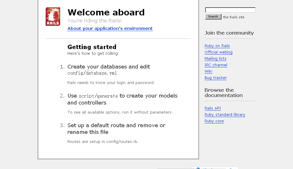5. 完成后在浏览器中输入地址http://127.0.0.1:3000,就可以看到刚才创建的项目,是一个Rails的页面,如图: