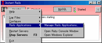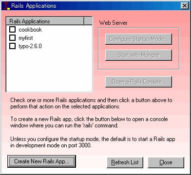 4. 在InstantRails中刷新项目列表,会看到刚刚生成的项目,在这里是myfirst,选中项目,并使用“start with Mongrel”启动,这时会看到下图: