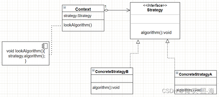 ConcreteStrategy: 具体策略类,是实现策略接口的类,重写策略接口所定义的抽象方法。