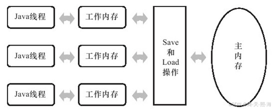 Java内存模型规定了所有的变量都存储在主内存(Main Memory)中(此处的主内存与上面介绍物理硬件时的主内存名字一样,两者也可以互相类比,但此处仅是虚拟机内存的一部分)。每条线程还有自己的工作内存(Working Memory,可与前面讲的处理器高速缓存类比),线程的工作内存中保存了被该线程使用到的从主内存复制的变量副本,线程对变量的所有操作(读取、赋值等)都必须在工作内存中进行,而不能直接读写主内存中的变量。不同的线程之间也无法直接访问对方工作内存中的变量,线程间变量值的传递均需要通过主内存来完成。
