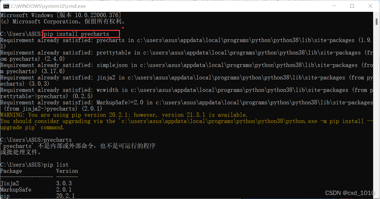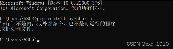 使用下面命令:pip install pyecharts 命令安装Pyecharts时返回“'pip' 不是内部或外部命令,也不是可运行的程序或批处理文件”。