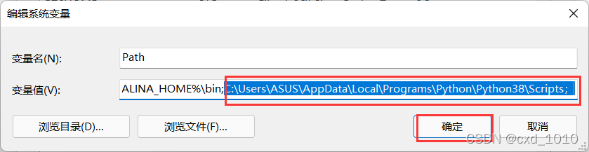 11、然后将Scripts的文件路径复制到变量值的分号“;”后面,记得要再加上分号“;”,然后点击确定。