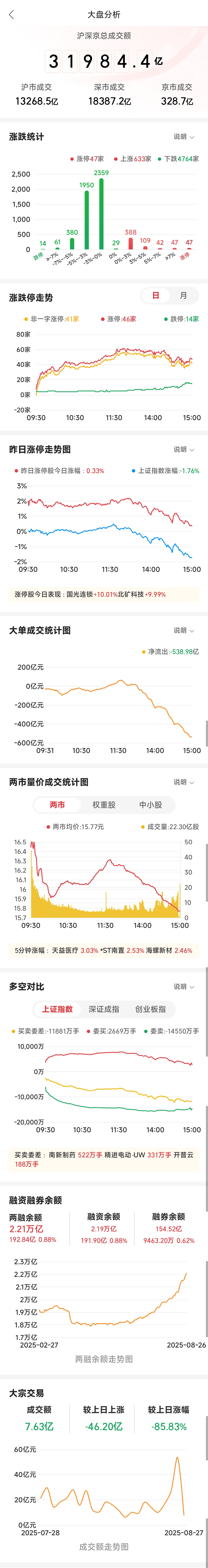 - 📉 指数与个股表现: 上证指数大跌 -1.76%,全市高达 4764家 公司下跌,上涨仅633家,市场情绪极度悲观。