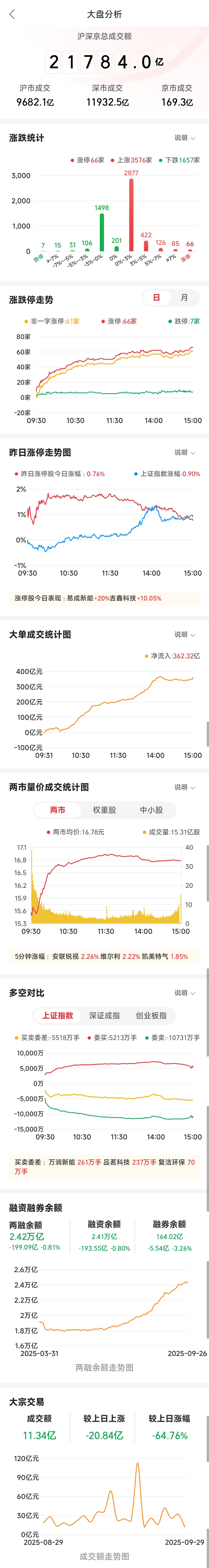 - 涨跌家数柱状图:上涨家数(3576)远高于下跌(1657),市场广度良好。