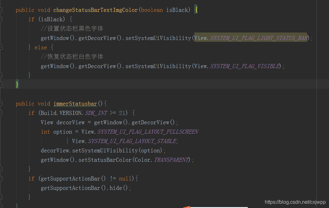 2.在BaseActivity里面添加如下两个方法(第一个方法是为了防止应用标题栏浅色与状态栏傻傻分不清;第二个方法是为了解决有些界面与状态栏分层断截)