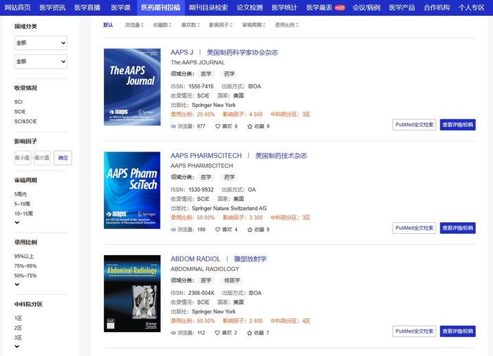 这里建议大家用常笑医学网的期刊查询工具,里面共收录了1600本中文期刊数据和4619本SCI期刊数据,包含医药卫生领域的国内外权威期刊,可以满足绝大多数用户的查刊和选刊需求。
