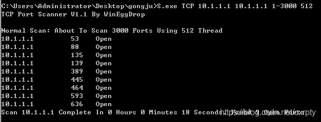 S.exe TCP 10.1.1.1 10.1.1.1 1-3000 512 /save