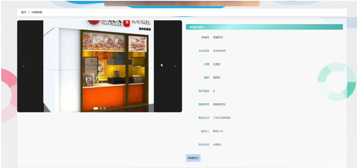 租户点击商铺信息;在商铺信息页面的输入栏填写商铺名称、车站名称、位置、预约状态,进行查询,然后还可以查看商铺名称、商铺号、车站名称、商铺图片、位置、面积、每月租金、商家账号、联系方式、联系人、预约状态等信息,如果有需要可以点击商铺预约等操作;如图5-15所示。