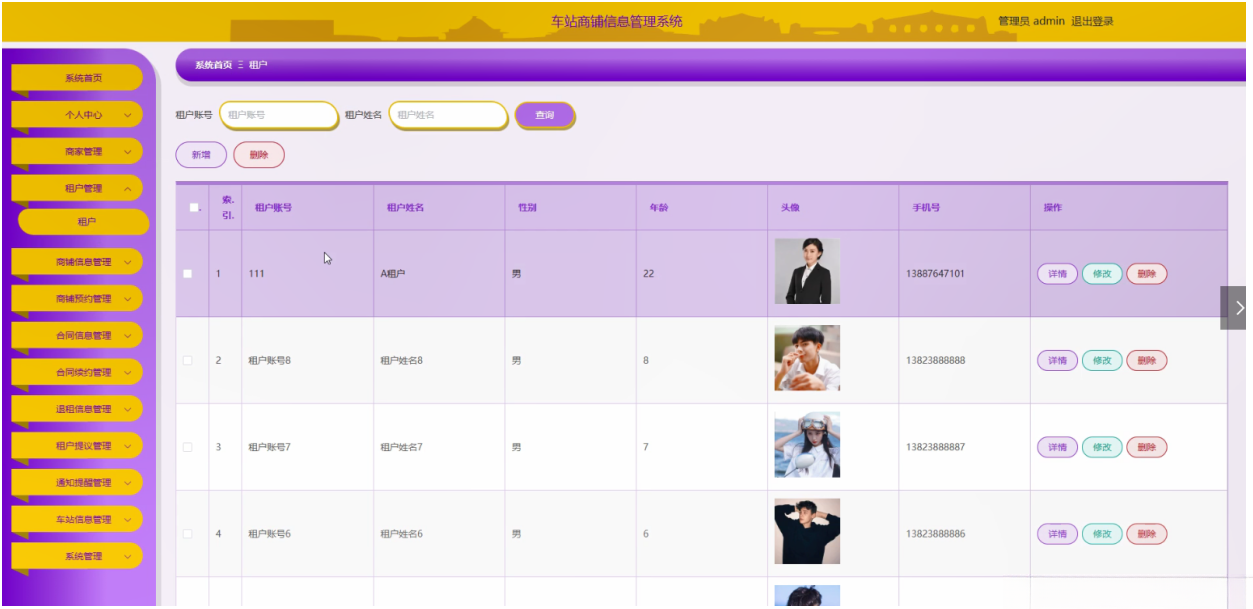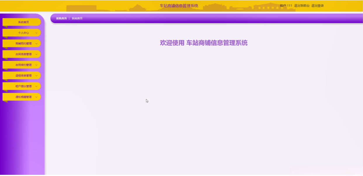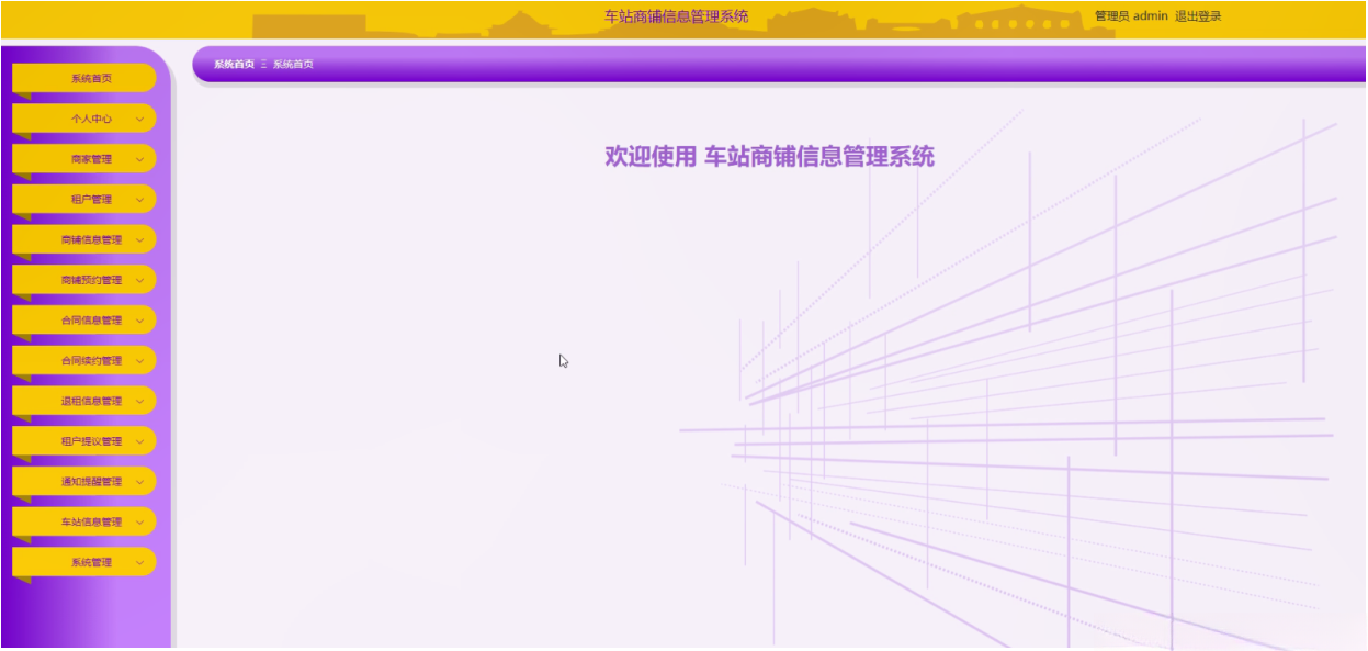 管理员登录系统后,可以对系统首页、个人中心、商家管理、租户管理、商铺信息管理、商铺预约管理、合同信息管理、合同续约管理、退租信息管理、租户提议管理、通知提醒管理、车站信息管理、系统管理等功能模块进行相应操作,如图5-2所示。