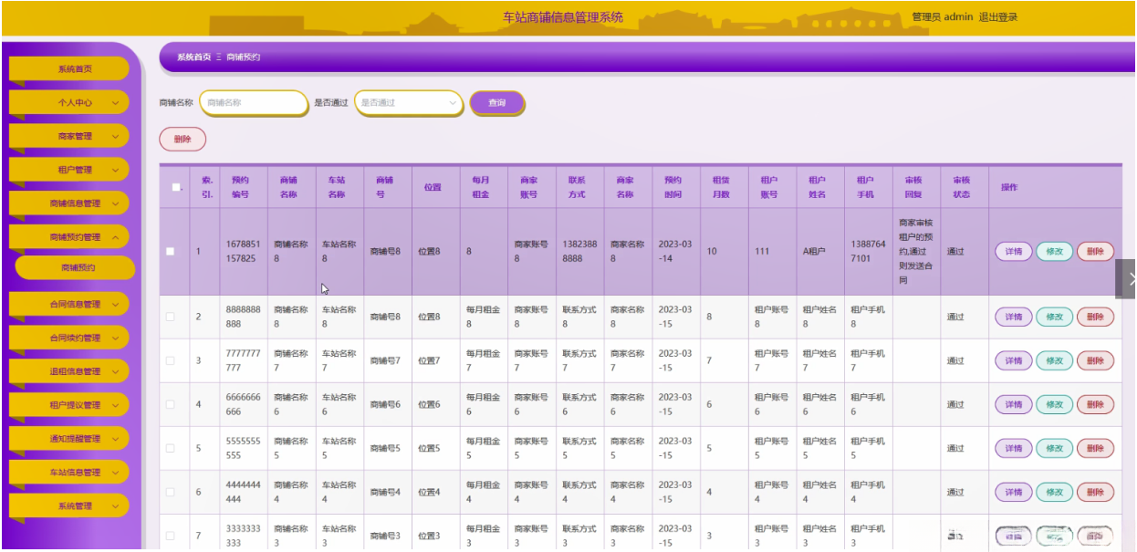 管理员点击商铺预约管理;在商铺预约管理页面输入预约编号、商铺名称、车站名称、商铺号、位置、每月租金、商家账号、联系方式、商家名称、预约时间、租赁月数、租户账号、租户姓名、租户手机、审核回复、审核状态等信息,进行查询或删除商铺预约等操作;如图5-6所示。
