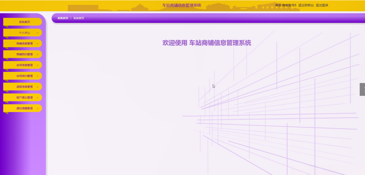 商家登录系统后,可以对系统首页、个人中心、商铺信息管理、商铺预约管理、合同信息管理、合同续约管理、退租信息管理、租户提议管理、通知提醒管理等功能进行相应操作,如图5-12所示。