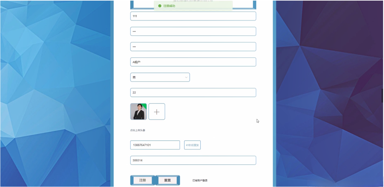 点击租户注册,租户通过注册页面填写账号、姓名、密码、确认密码、头像、性别、生日、手机等信息,然后点击注册操作,如图5-13所示。