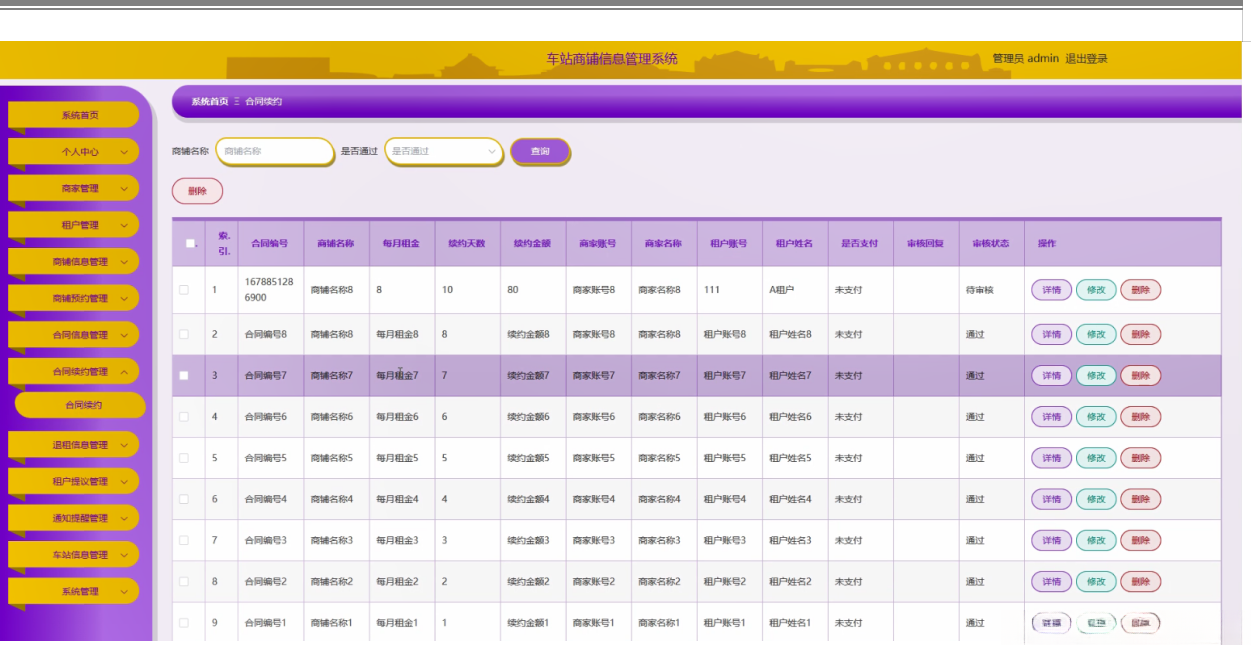 管理员点击合同续约管理;在合同续约管理页面对合同编号、商铺名称、每月租金、续约天数、续约金额、商家账号、商家名称、租户账号、租户姓名、是否支付、审核回复、审核状态等信息,进行查询或删除合同续约等操作;如图5-7所示。
