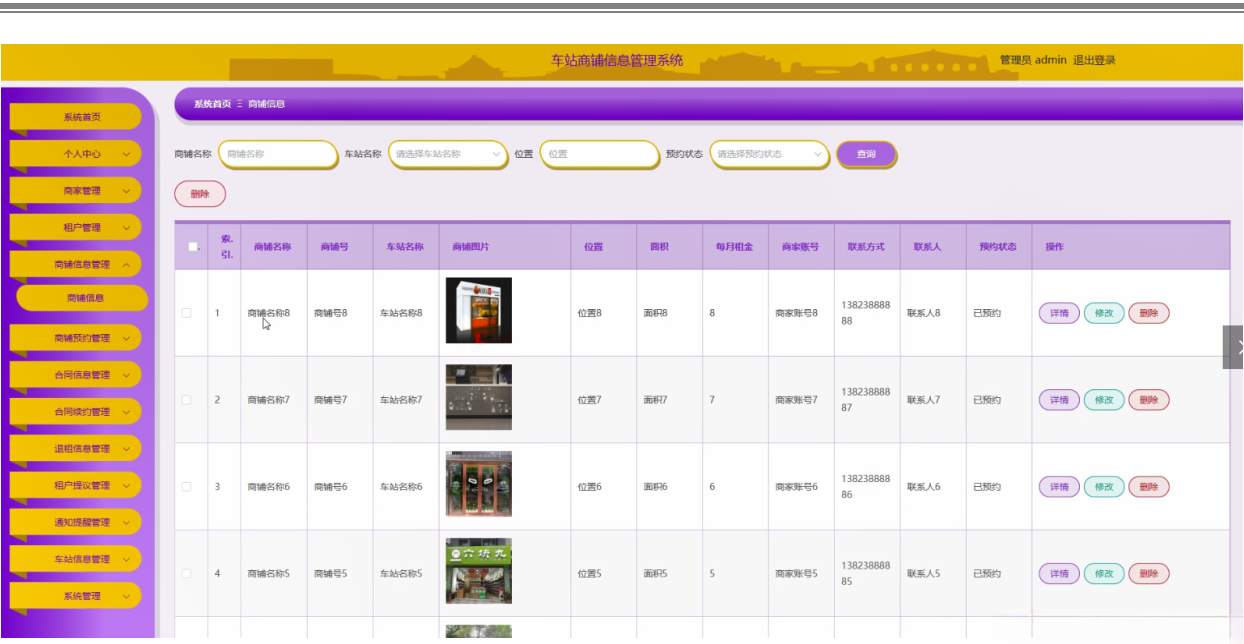 管理员点击商铺信息管理;在商铺信息管理页面对商铺名称、商铺号、车站名称、商铺图片、位置、面积、每月租金、商家账号、联系方式、联系人、预约状态等信息,进行查询或删除商铺信息等操作;如图5-5所示。