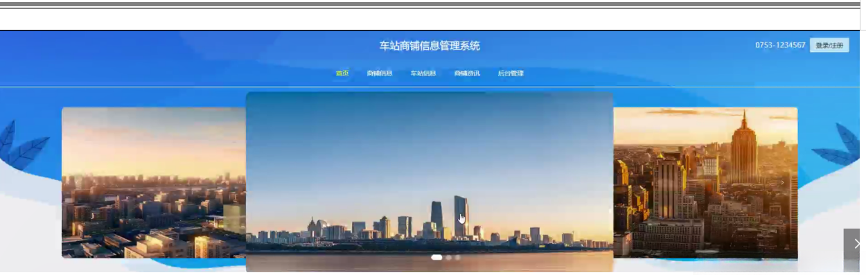 当游客打开系统的网址后,首先看到的就是首页界面。在这里,游客能够看到车站商铺信息管理系统的导航条显示首页、商铺信息、车站信息、商铺资讯、后台管理、个人中心等。系统首页界面如图5-13所示: