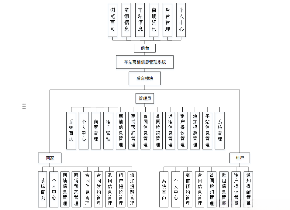 根据上文中对用户需求的一系列综合细致的分析,针对本文基于SpringBoot的车站商铺信息管理系统,得到一个如图4-1所示的宏观的功能模块结构图。