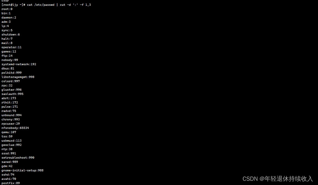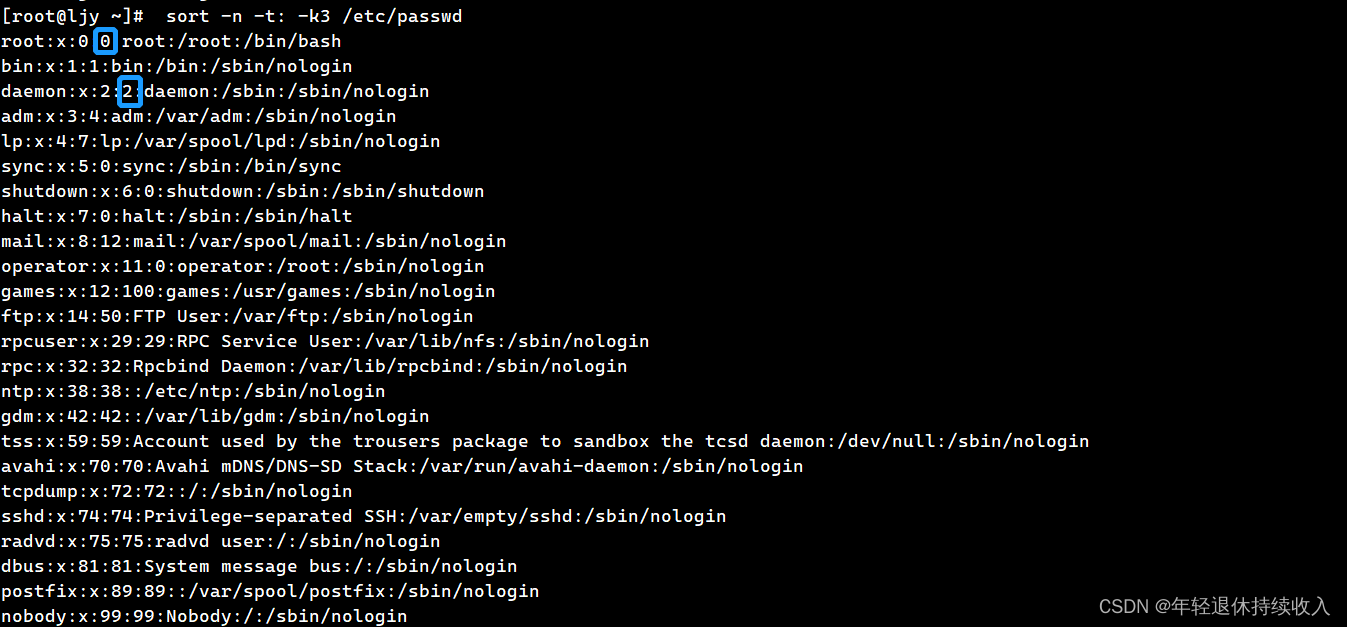 [root@ljy ~]# sort -n -t: -k3 /etc/passwd ##以冒号为分隔符,以数字大小对第三列排序(升序)