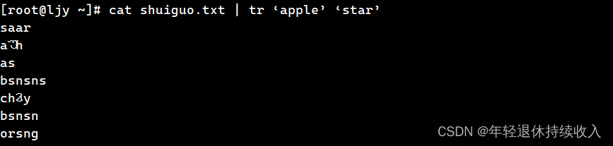 [root@ljy~]# cat shuiguo.txt | tr ‘apple’ ‘star’ ##替换字母 即a-s p-a(pp相同去后一个a) le-r