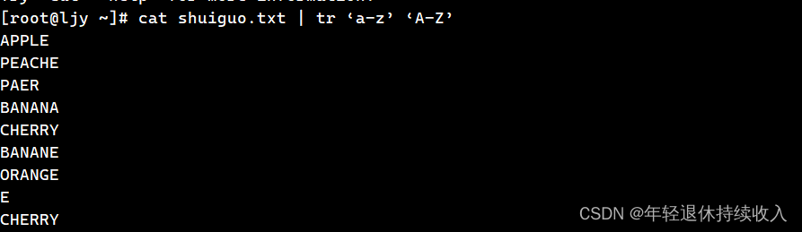 [root@ljy ~]# cat shuiguo.txt | tr ‘a-z’ ‘A-Z’ ##小写字母全部替换成大写