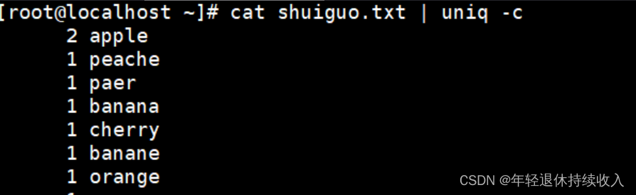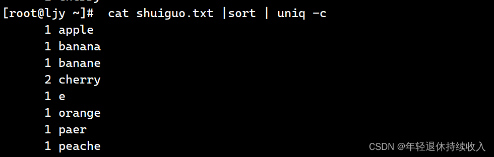[root@ljy ~]# cat shuiguo.txt |sort | uniq -c ##结合sort使用就是我们想要的效果