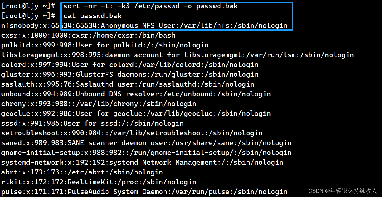 [root@ljy ~]# sort -nr -t: -k3 /etc/passwd -o passwd.bak ##将输结果不在屏幕上输出而是输出到passwd.bak文件