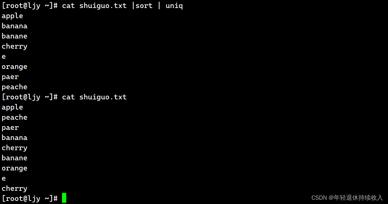 [root@localhost ~]# cat shuiguo.txt |sort | uniq ##结合sort使用,去重仅是显示改变,文本内容不变
