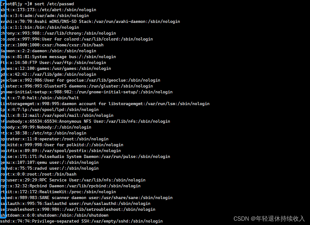 [root@ljy ~]# sort /etc/passwd ##加任何选项默认按第一列升序,字母的话就是从a到z由上而下显示